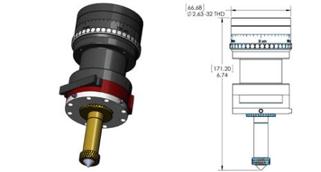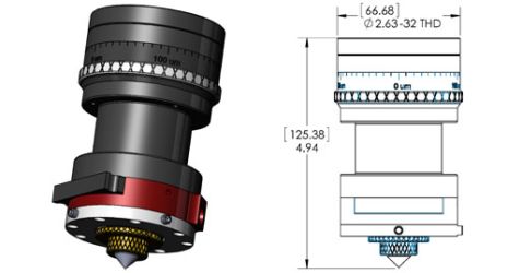 Fiber Laser Process Head assembly configuration shows base unit with MMH-25-060-NE 60mm nozzle extension. The unit features provision for a 34mm diameter multi element focus lens set. +/- 4mm focus adjustment with 10um resolution. +/- 1.25mm X-Y nozzle tip adjustment with fine pitch adjusters. Cover glass cartridge with provision for 25mm x 3mm cover glass.,(Cover glass rated at 200psi). 1/8 BSPP tapped hole for process gas fitting. Quick-change laser process head mount. Anodized aluminum, stainless steel and brass construction.