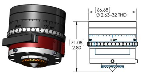 Fiber Laser Process Head assembly configuration shows base unit with MMH-25-080-NE 80mm nozzle extension. The unit features provision for a 34mm diameter multi element focus lens set. +/- 4mm focus adjustment with 10um resolution. +/- 1.25mm X-Y nozzle tip adjustment with fine pitch adjusters. Cover glass cartridge with provision for 25mm x 3mm cover glass.,(Cover glass rated at 200psi). 1/8 BSPP tapped hole for process gas fitting. Quick-change laser process head mount. Anodized aluminum, stainless steel and brass construction.