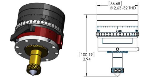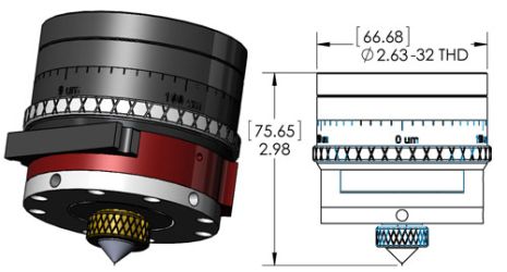 The Micromachining Fiber Laser Process Head assembly is modular in design. It will accommodate focal lengths of 50mm, 60mm, 80mm, 100mm and 150mm. The base unit (MMH-25-34-50) is set-up for a 50mm f.l. The unit features provision for a 34mm diameter multi element focus lens set. +/- 4mm focus adjustment with 10um resolution. +/- 1.25mm X-Y nozzle tip adjustment with fine pitch adjusters. Cover glass cartridge with provision for 25mm x 3mm cover glass.,(Cover glass rated at 200psi). 1/8 BSPP tapped hole for process gas fitting. Quick-change laser process head mount. Anodized aluminum, stainless steel and brass construction.