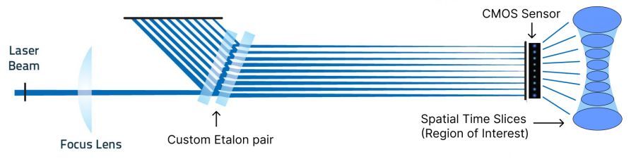 The spatial time slices generated by the custom etalon pair are captured by a high-speed CMOS sensor, which has been adapted by removing the window to eliminate any interference effects. This sensor setup enables the BWA-CAM to provide rapid feedback on the beam's properties, facilitating real-time analysis. |